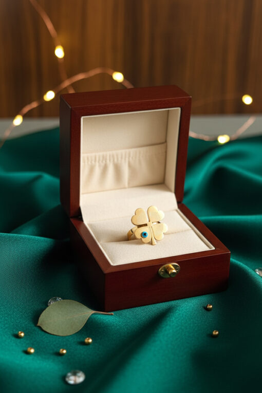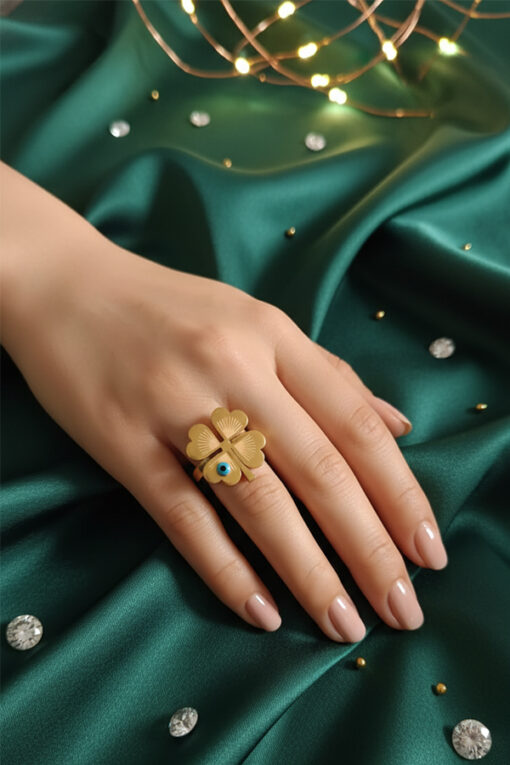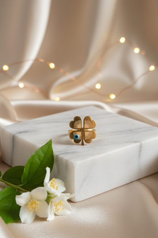 Golden Clover Evil Eye Ring – Symbol of Luck and Protection