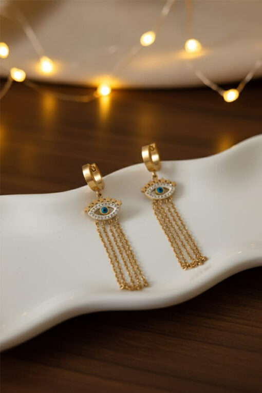 Elevate your style with these exquisite Golden Evil Eye Dangle Earrings, crafted to blend luxury with symbolism. Featuring a stunning evil eye centerpiece adorned with shimmering stones, these earrings symbolize protection and positive energy. The elegant gold finish adds a radiant glow, while the cascading chain tassels bring a touch of movement and sophistication. Perfect for evening wear or festive occasions, these earrings complement both modern and traditional outfits effortlessly. Lightweight and durable, they promise comfort with charm. Add a statement of grace and good luck to your jewelry collection with these mesmerizing evil eye chain earrings.