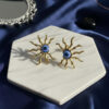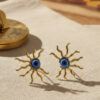Designed with intricate sunray detailing in lustrous gold tones, each earring features a striking blue evil eye centerpiece—believed to ward off negativity and attract positive energy.