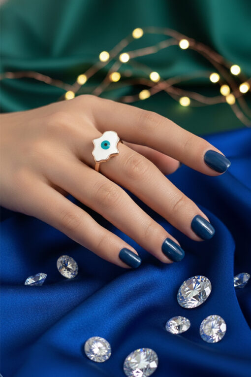 Elevate your style with the Hamsa Evil Eye Gold Ring – a perfect blend of beauty, spirituality, and elegance. Designed in the iconic Hamsa hand shape, this ring features a radiant white enamel base adorned with a striking turquoise evil eye at its center. Symbolizing protection, luck, and positive energy, it serves as both a fashion statement and a spiritual talisman. Ideal for gifting or self-adornment, this exquisite piece reflects grace, confidence, and the timeless power of good fortune. Protect your aura with pure sophistication.