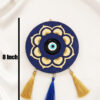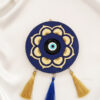 The design features a rich deep blue background adorned with a beautifully hand-painted, metallic gold floral or mandala pattern, symbolizing harmony and beauty. Set at the center is a traditional, powerful glass Evil Eye medallion (Nazar), the globally recognized talisman used to ward off negative energy and bring good fortune. The piece is finished with a trio of decorative tassels—two in a rich gold tone and one in vibrant blue—adding movement and a luxurious flair. This beautiful and deeply meaningful piece serves as both a stylish decorative accent and a potent amulet. It is perfect for hanging in a prominent location, making it an ideal gift for housewarmings or anyone seeking to infuse their space with luck and sophisticated artistic charm.