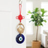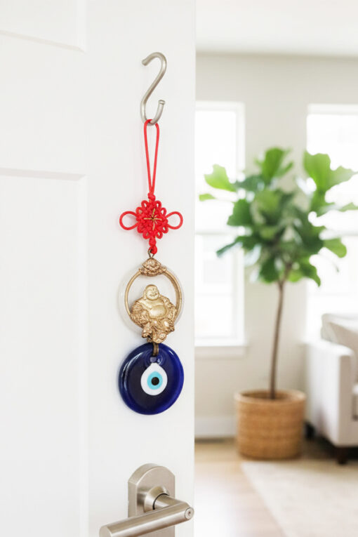 Bring peace, prosperity, and powerful protection to your space with this unique spiritual hanging. The centerpiece features a prominent Laughing Buddha charm, symbolizing wealth, happiness, and contentment, set against a jade or pale ring. Below it hangs a traditional deep blue glass Evil Eye medallion (Nazar), renowned globally for warding off negative energy. The top features a vibrant red Chinese knot, which traditionally represents good luck and longevity. This piece seamlessly merges Eastern and Mediterranean protective symbols, making it a powerful amulet for any home, office, or car. It is an ideal and thoughtful gift, perfect for anyone seeking to infuse their surroundings with meaningful protection and positive energy.