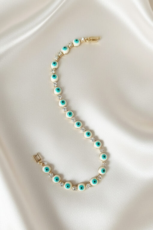 Adorn your wrist with this magnificent Anti-Tarnish Evil Eye Tennis Bracelet. The flexible chain features a continuous line of alternating charms: luminous mother-of-pearl or enamel Evil Eye motifs and sparkling micro-pave crystal circles. The vibrant blue eyes, the classic symbol of protection and good fortune, contrast beautifully with the dazzling white crystals. Its classic tennis bracelet structure and secure clasp provide a luxurious look and comfortable fit. Perfect for layering with other bracelets or wearing solo as a striking statement piece, this piece is an essential accessory for anyone who loves glamorous, meaningful, and high-quality jewelry.