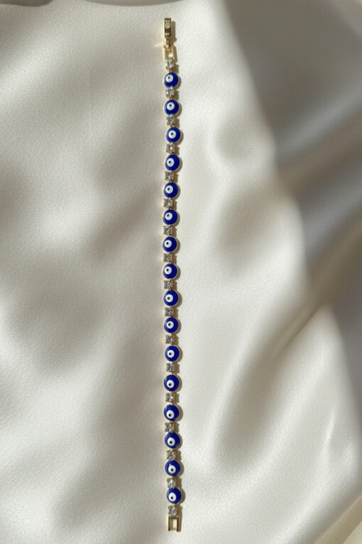 Adorn your wrist with this luxurious and protective Evil Eye tennis bracelet, featuring an anti-tarnish finish for enduring brilliance. Each link alternates between a shimmering square micro-pave crystal and a vibrant classic blue Evil Eye charm. This stunning combination of sparkle and symbolism creates a piece that is both incredibly chic and deeply meaningful. The Evil Eye is a globally recognized talisman believed to offer powerful protection and good fortune to the wearer. Its timeless design and secure clasp make it perfect for wearing every day or for adding a touch of red-carpet glamour to special occasions. This durable bracelet is a must-have for those who appreciate detailed craftsmanship and meaningful, dazzling jewelry.
