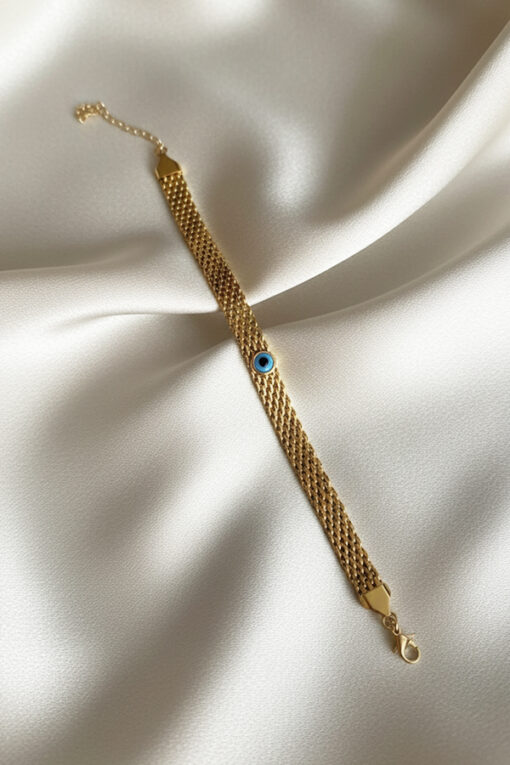 Crafted with an anti-tarnish finish, this durable piece is designed to keep its rich, polished gold tone for long-lasting wear. The bracelet features a distinctive woven mesh design, giving it a fluid, flexible, and high-end feel that sits beautifully flat on the skin. At the center is a subtle, yet powerful Evil Eye charm with a bright blue iris, a timeless talisman believed to offer protection and good fortune. Its sophisticated texture and clean lines make it an ideal accessory for both professional settings and elevated casual wear. This bracelet is a perfect choice for those who appreciate understated luxury and unique, meaningful craftsmanship.