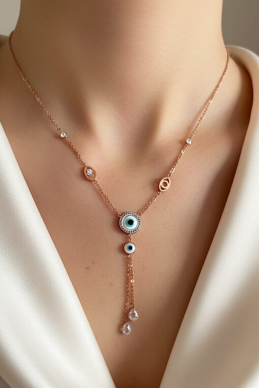 This piece is designed for enduring shine and features a delicate chain accented with brilliant satellite crystals and subtle oval motifs. The necklace forms a sophisticated Y-drop, anchored by a dazzling circular Evil Eye pendant, meticulously detailed with a white and blue iris and encircled by tiny crystals. Below this, the pendant drops into a tassel featuring a smaller evil eye charm and two shimmering faceted crystal tear drops. The Evil Eye is a powerful symbol of protection and good fortune. Crafted to be anti-tarnish, this durable and striking accessory is perfect for showcasing an elegant, deep V-neckline. It offers continuous sparkle and meaning without worrying about wear.