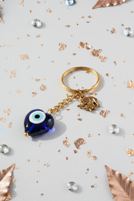 Luxurious Gold & Blue Heart Evil Eye Keychain with Lucky Elephant Charm