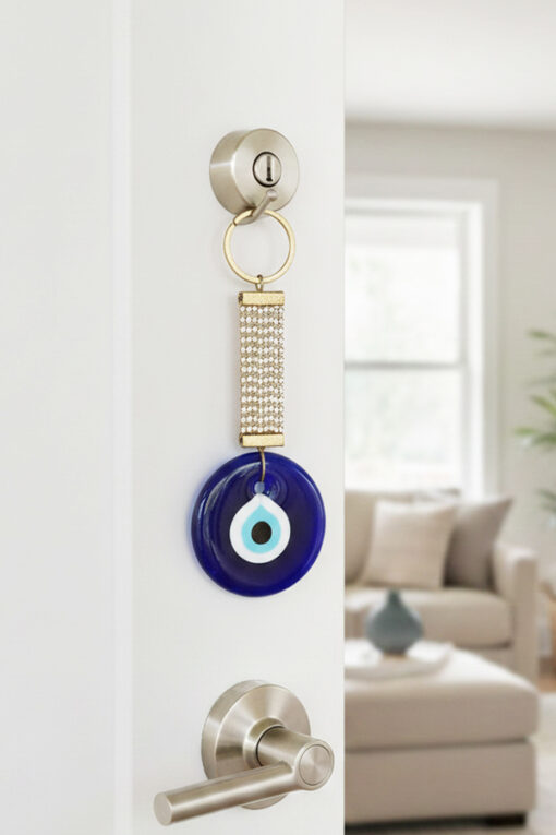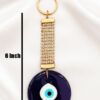 Bring dazzling glamour and powerful protection to your space with this stunning Evil Eye hanging. The centerpiece is a prominent, polished deep blue glass Evil Eye medallion (Nazar), the globally recognized talisman used to ward off negative energy and bring good fortune. The medallion is suspended by a chic gold-toned link that is completely encrusted with multiple rows of shimmering micro-pave crystals, creating a waterfall of sparkle. This luxurious design elevates the traditional protective charm to a statement piece of decor. Perfect for hanging near an entrance, in a window, or as a glamorous car accessory, this beautiful and meaningful item makes an ideal, unforgettable gift for housewarmings or anyone seeking luck and sophisticated style.