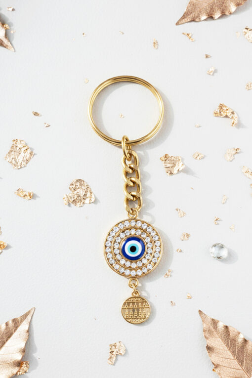 Carry opulent style and powerful protection with this exquisite gold-toned keychain. The centerpiece is a dazzling, circular Evil Eye medallion, beautifully framed by a halo of shimmering micro-pave crystals that catch the light brilliantly. Dangling gracefully beneath the eye is a small, polished round charm with an intricate engraved pattern, adding an extra touch of elegance and movement. This timeless motif is renowned globally for providing powerful protection and good fortune against negative energy. The durable gold-toned keyring and chunky link chain ensure you can easily attach this eye-catching accessory to your keys, handbag, backpack, or wallet. This decorative piece makes an ideal and thoughtful gift, blending high-end glamour with meaningful, powerful symbolism.