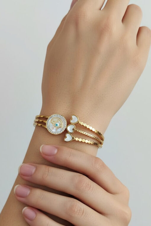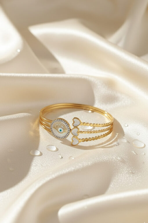 The design features a multi-band structure creating the effect of three stacked bracelets in one. The focal point is an elegant circular charm displaying a luminous mother-of-pearl Evil Eye, framed by shimmering micro-pave crystals for added glamour. The opposing side showcases charming white mother-of-pearl heart charms linked by delicate chains and textured gold details. This unique piece offers a powerful symbol of luck and love in one luxurious accessory. Perfect for those who love bold, layered looks, this durable bangle is an eye-catching addition to any collection and an unforgettable gift for a loved one.