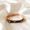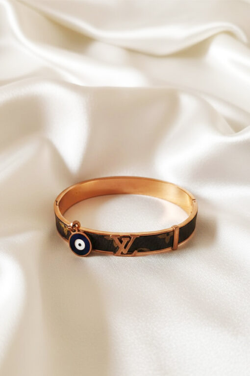 Elevate your accessory collection with this exquisite Rose Gold Cuff Bangle, a stunning piece that effortlessly blends high-end fashion aesthetics with timeless spiritual protection. The bracelet features a structured, polished rose gold band that radiates warmth and sophistication. The exterior is inlaid with a classic dark brown patterned texture, reminiscent of iconic luxury monogram designs, giving the piece an instantly recognizable and upscale appeal. Dangling playfully from the side is a traditional round Evil Eye charm, featuring a deep navy blue and white enamel finish. This ancient talisman is not merely decorative; it is a powerful symbol traditionally worn to ward off negative energy and attract good fortune and positivity to the wearer. Designed with a discreet hinged closure, this bangle ensures a secure and comfortable fit, making it perfect for all-day wear. It strikes the ideal balance between a bold statement piece and everyday elegance. Whether paired with a classic watch for a professional look or stacked with other gold bracelets for a night out, this durable and stylish bangle is a must-have for those who love luxury with a meaning.