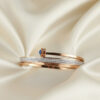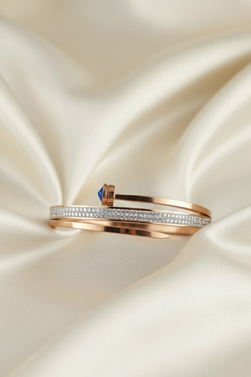 Make a daring and glamorous statement with this unique bangle, inspired by the iconic nail design. Crafted with a polished rose gold finish, the bracelet features a sophisticated wrap-around structure that creates the illusion of two separate bands. The top band is fully encrusted with brilliant, shimmering micro-pave crystals, adding dazzling light and luxury to the piece. The closure, designed to resemble a nail head, is accented with a deep blue gemstone, providing a striking pop of color and a bold finish. This durable, secure bangle is perfect for those who love bold, high-fashion accessories.