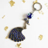The design features a beautifully detailed silver peacock charm, a majestic bird symbolizing beauty, royalty, and watchfulness. The peacock’s tail is richly embellished with an intricate pattern of shimmering deep blue gemstones, giving it a luxurious, dazzling finish. Hanging above the peacock is a classic blue and white Evil Eye bead, a powerful talisman renowned globally for bringing good luck and safeguarding against negative energy. This accessory is an ideal, thoughtful gift that blends intricate artistry with meaningful, protective symbolism. The durable silver-toned keyring and lobster clasp ensure this statement piece can be securely attached to your keys, handbag, or used as a decorative car accessory.