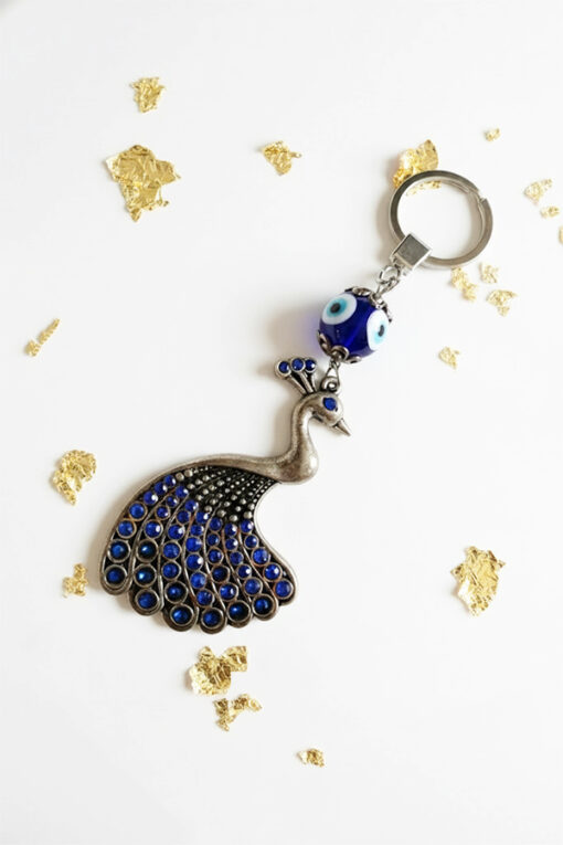 Luxurious Silver Peacock & Evil Eye Keychain with Blue Gemstones