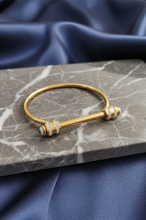 Elevate your elegance with the Luxury Evil Eye Golden Bangle, a perfect blend of sophistication and symbolism. Crafted from premium metal with a lustrous gold finish, this sleek bangle features a minimalist cylindrical bar design adorned with sparkling cubic zirconia bands and a subtle blue evil eye charm on each end. Symbolizing protection and good energy, it’s designed to shield you from negativity while enhancing your modern style. Lightweight yet durable, this timeless piece is ideal for daily wear or special occasions.