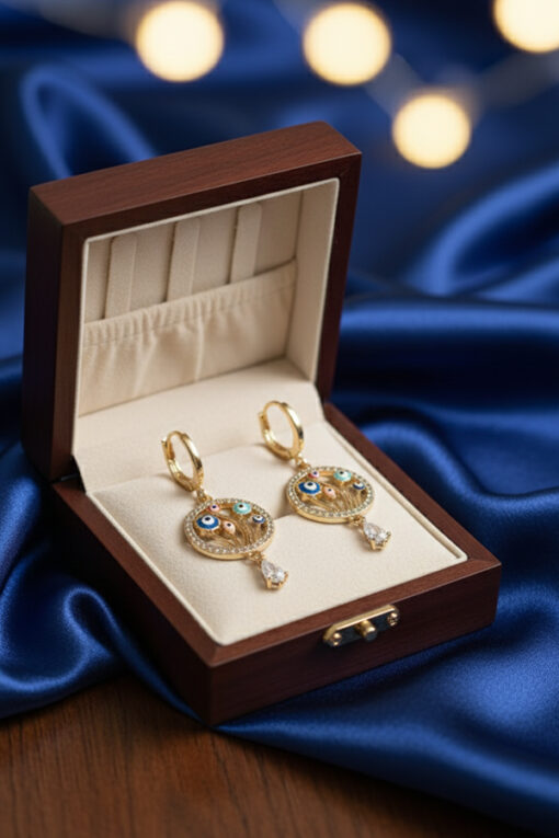 These Luxury Multicolor Evil Eye Gold Drop Earrings blend elegance with vibrant symbolism. Each earring is beautifully finished with a sparkling teardrop crystal that adds sophistication and charm. Crafted from premium gold-plated alloy with precision detailing, these earrings are lightweight, comfortable, and perfect for both festive occasions and everyday wear. The combination of colors and textures gives them a unique artistic appeal. Presented in a stylish gift box, they make an ideal present for someone who loves meaningful and fashionable jewelry.