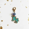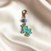 The centerpiece is a detailed, joyful unicorn charm, beautifully rendered in a striking aqua/teal enamel with a rose gold outline. The unicorn symbolizes fantasy, purity, and power. Suspended just above the unicorn is a classic blue and white Evil Eye bead, a powerful and traditional talisman believed to bring good luck and safeguard against negative energy. The rose gold-toned lobster clasp makes this charm incredibly versatile; easily clip it onto your purse zipper, keyring, backpack, or use it as a fun accessory for necklaces or bracelets. This durable and playful piece is an ideal, thoughtful gift for anyone who loves fantasy, color, and meaningful, protective symbolism.