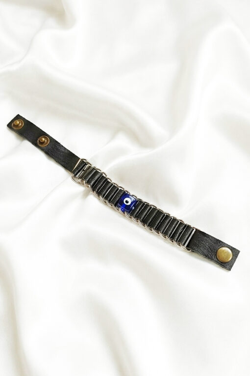 Men’s Black Leather & Metal Link Bracelet with Blue Evil Eye Protection