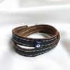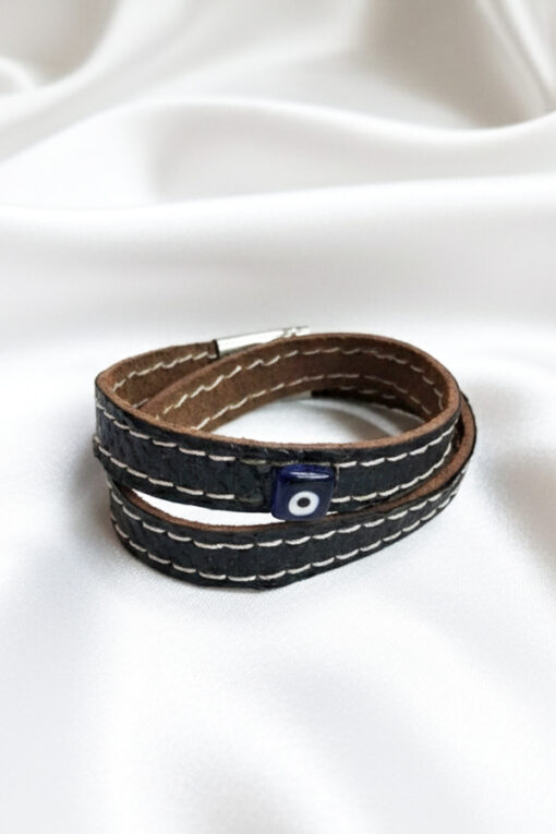 Men’s Black Leather Wrap Bracelet with Contrast Stitching & Square Evil Eye
