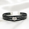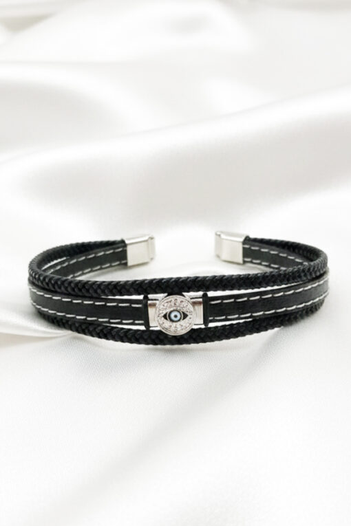Elevate your wrist game with this distinguished Men’s Multi-Strand Leather Bracelet, a perfect accessory for the man who appreciates detailed craftsmanship and modern style. This bracelet features a dynamic, layered design that combines distinct textures: thick braided leather cords frame a central flat leather band detailed with crisp white contrast stitching. The focal point of this piece is a striking circular silver-toned charm, encrusted with shimmering pavé crystals that encircle a central Evil Eye. The sparkle of the crystals offers a sharp, elegant contrast to the rugged black leather, making it suitable for both casual outings and evening wear. Finished with a robust, polished silver-toned metal clasp, the bracelet ensures a secure and comfortable fit. Its sturdy construction and versatile design make it an ideal gift for the fashion-forward man who wants to combine protection with high-end street style.