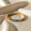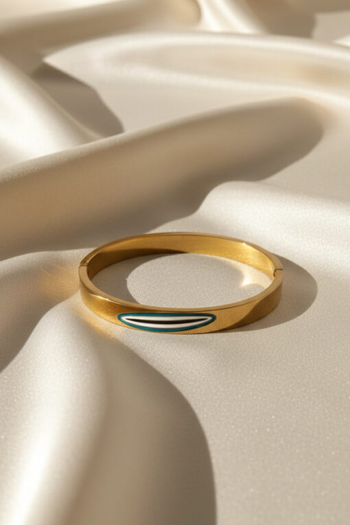 Define your style with this ultra-modern gold cuff bangle. This accessory is the epitome of sleek, contemporary design, featuring a smooth, polished band with a striking, elongated center inlay.The inlay displays an abstract interpretation of the Evil Eye charm, using vibrant shades of teal and dark blue enamel. Perfect for those who appreciate minimalist luxury, the bangle’s clean lines and secure fit make it ideal for stacking or wearing alone as a sophisticated statement piece. It’s a chic and meaningful accessory that seamlessly blends protective symbolism with high-fashion elegance.