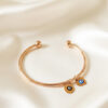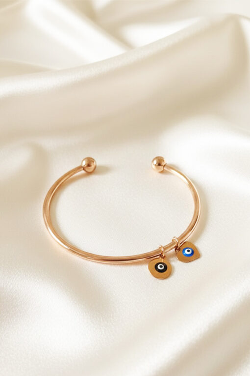 Minimalist Rose Gold Open Cuff Bangle with Dual Heart & Round Evil Eye Charms