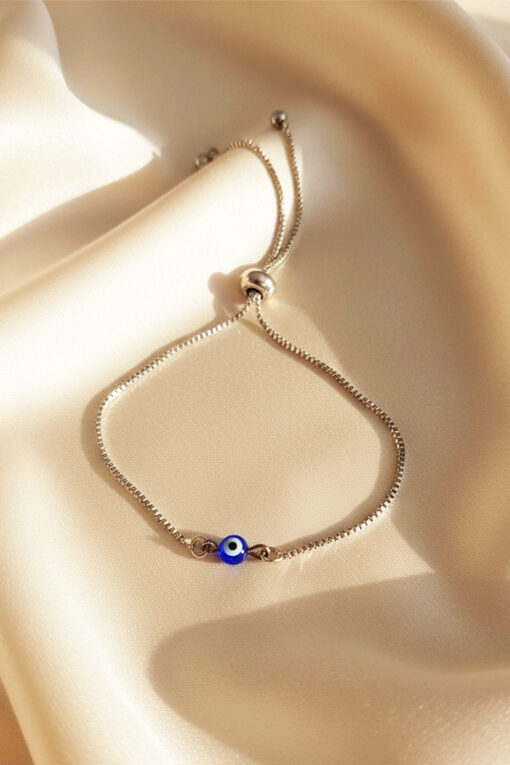 The centerpiece is a small, striking Evil Eye bead rendered in classic deep blue and white enamel, which slides elegantly along the chain.