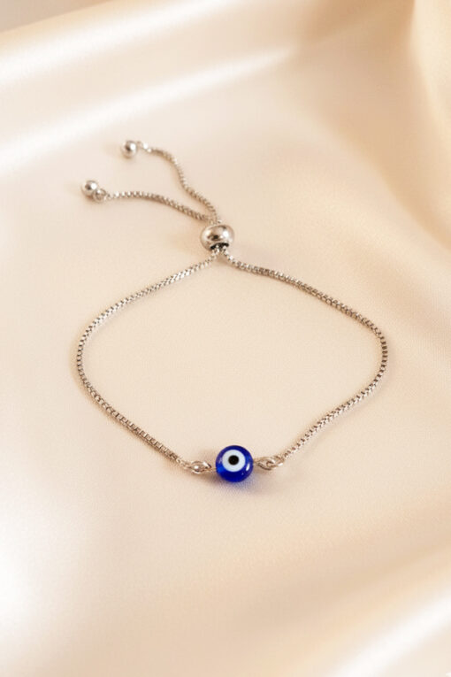 Adorn your wrist with this exquisite and perfectly adjustable silver bracelet. The piece features a fine, sleek box chain and a secure slider mechanism (or bolo clasp), allowing you to easily adjust the bracelet for a comfortable, custom fit for any wrist size. The centerpiece is a small, striking Evil Eye bead rendered in classic deep blue and white enamel, which slides elegantly along the chain. Its ultra-minimalist design, combined with its brilliant silver finish, makes it incredibly chic and versatile. Ideal for subtle, everyday elegance or layering beautifully with bolder cuffs, this durable accessory is an essential, worry-free piece for those who appreciate personalized fit and sophisticated, meaningful style.