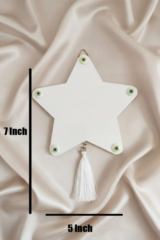 The piece features a prominent, clean white five-pointed star, symbolizing hope, guidance, and good fortune. Subtly integrated into the star’s points are small green Evil Eye accents, which offer a powerful shield against negative energy and a symbol of good health and success. A soft white tassel hangs from the bottom, adding an elegant, bohemian touch and movement. This meaningful item serves as both a stylish decorative accent and a potent amulet. It is perfect for hanging in a child’s room, nursery, living area, or office, making it an ideal gift for housewarmings or anyone seeking to infuse their space with luck and sophisticated, minimalist design.
