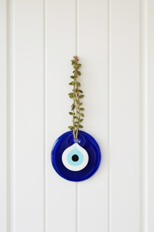 Traditional Turkish Blue Glass Evil Eye Wall Hanging with Beaded Chain