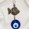 Bring powerful protection, abundance, and vibrant color into your space with this stunning wall hanging. The centerpiece features a detailed fish charm (symbolizing prosperity and good luck), rendered in an antique copper/bronze tone. Dangling beneath the fish is a large, polished deep blue glass Evil Eye medallion (Nazar), the globally recognized talisman revered for its power to ward off negative energy. A small Evil Eye bead is also attached at the top. This meaningful piece serves as both a luxurious decorative accent and a potent amulet. It is perfect for hanging near an entrance, in a living space, or in a car, making it an ideal, thoughtful gift for housewarmings or anyone seeking unique, symbolic art.