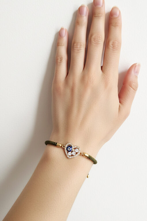 Olive Green Twisted Cord Evil Eye Heart Bracelet – Adjustable Gold-Tone Crystal Pave Charm for Protection & Style