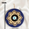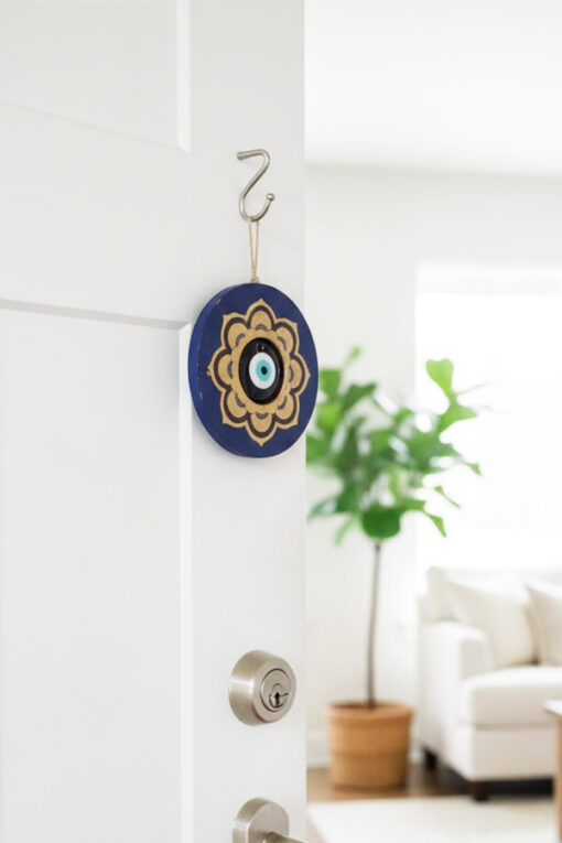 Bring exquisite artistry and powerful protection to your space with this unique decorative hanging. The round piece features a stunning, rich navy blue background overlaid with an intricate gold and black floral or mandala design. At the center is a classic, prominent glass Evil Eye bead (Nazar), the globally recognized talisman used to ward off negative energy and bring good fortune. The fusion of the calming mandala pattern (symbolizing harmony) and the protective eye creates a truly striking and meaningful amulet. This beautifully crafted item serves as both a stylish bohemian accent and a potent talisman, making it an ideal gift for housewarmings or anyone seeking to infuse their space with luck and artistic elegance.