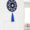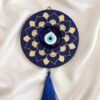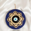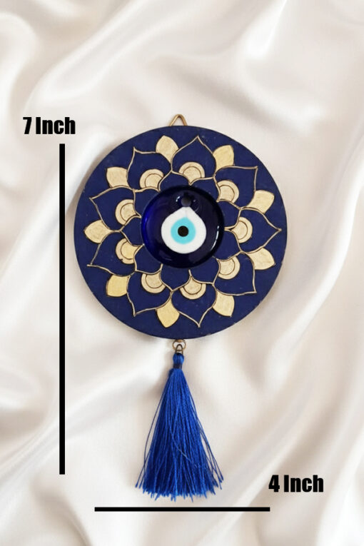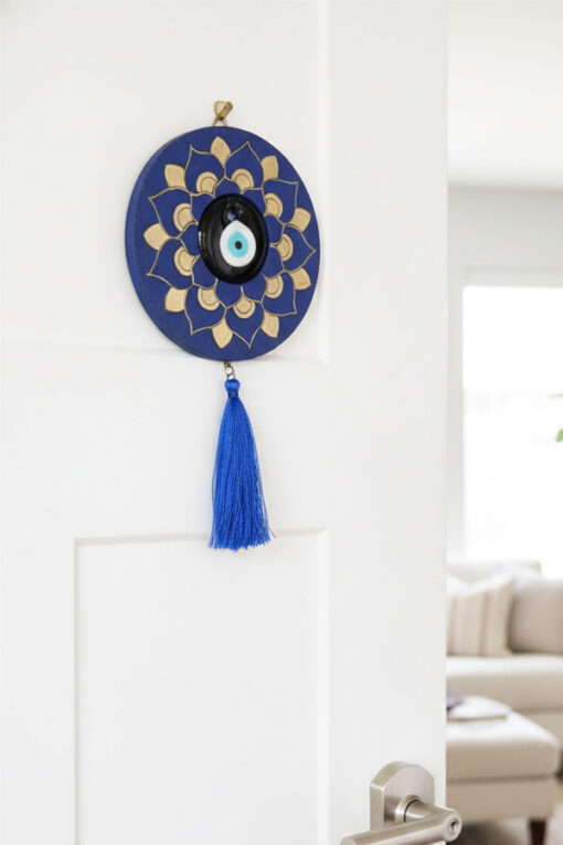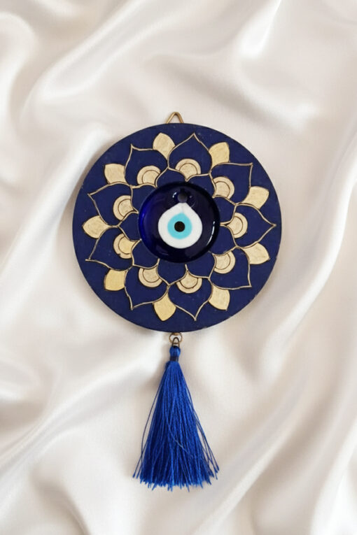 The design features a rich deep blue background adorned with a beautifully hand-painted, metallic gold mandala or floral pattern, symbolizing harmony and eternity. Set at the center is a traditional, powerful glass Evil Eye medallion (Nazar), the globally recognized talisman used to ward off negative energy and bring good fortune. A vibrant deep blue tassel hangs below, adding elegant movement and a finished, luxurious look. This beautiful and deeply meaningful piece serves as both a stylish decorative accent and a potent amulet. It is perfect for hanging in a prominent location, making it an ideal gift for housewarmings, yoga studios, or anyone seeking to infuse their space with luck and sophisticated artistic flair.