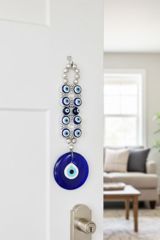 Bring layered protection and elaborate style to your space with this magnificent ornamental hanging. The design features two central silver-toned geometric medallions, richly embellished with micro-pave crystals and multiple small blue Evil Eye motifs. The hanging is anchored by a large, polished deep blue glass Evil Eye medallion (Nazar) at the bottom, which is the traditional and powerful symbol used to ward off negative energy and bring good fortune. This beautiful and intricately detailed piece serves as both a luxurious decorative accent and a potent amulet. It is perfect for hanging near an entrance, in a window, or on a wall, making it an ideal, unforgettable gift for housewarmings or anyone seeking layered protection and sophisticated decor.