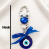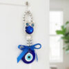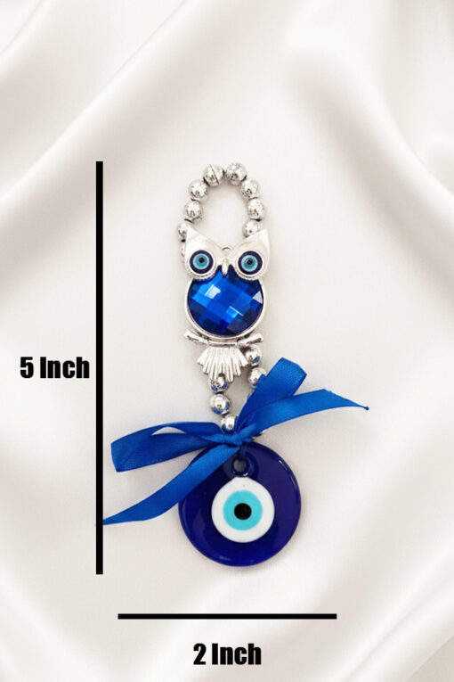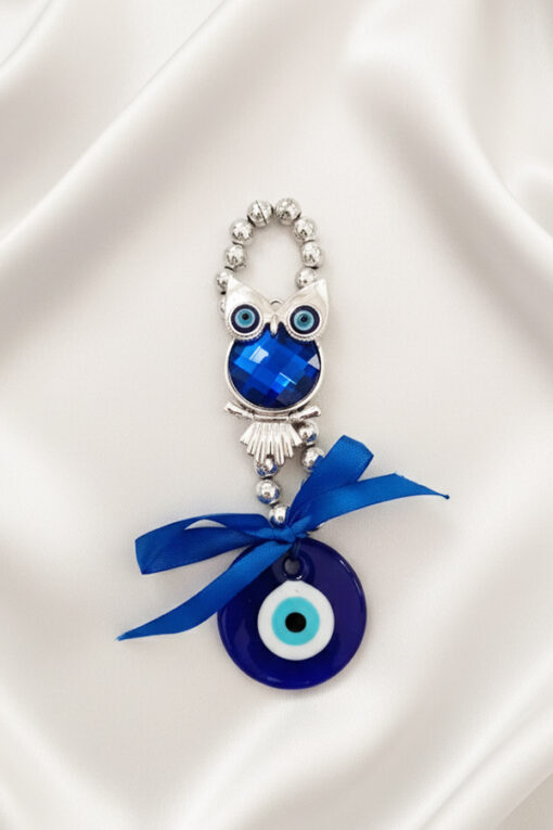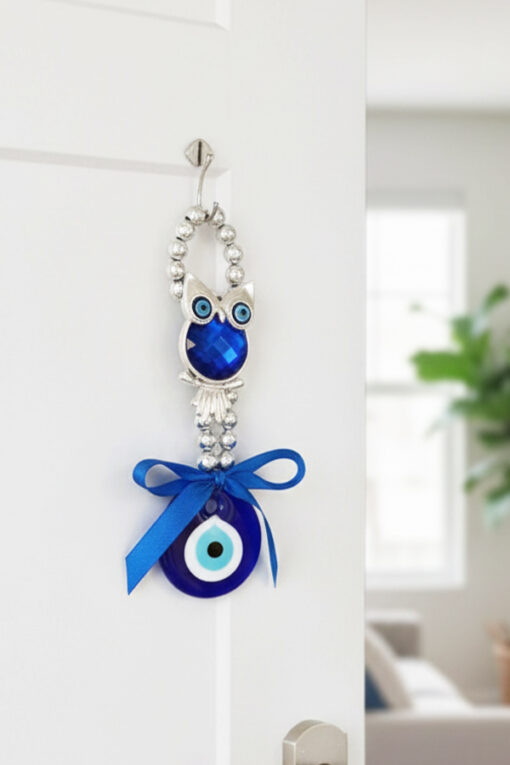 Bring wisdom, luck, and sophisticated protection to your space with this beautiful ornamental hanging. The design features a charming silver owl charm, a classic symbol of wisdom and intuition, beautifully accented with deep blue faceted crystals. Anchoring the piece is a traditional, powerful glass Evil Eye medallion (Nazar), the globally recognized talisman used to ward off negative energy and bring good fortune. A decorative blue ribbon bow connects the charms, adding a touch of elegance. This beautiful and meaningful piece serves as both a stylish decorative accent and a potent amulet. It is perfect for hanging in an entryway, window, or car, making it an ideal gift for housewarmings or anyone seeking to infuse their space with luck and thoughtful style.