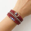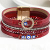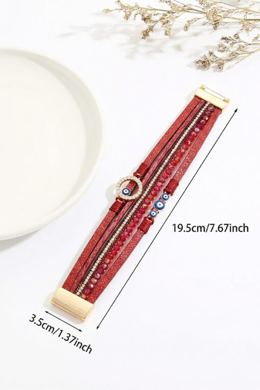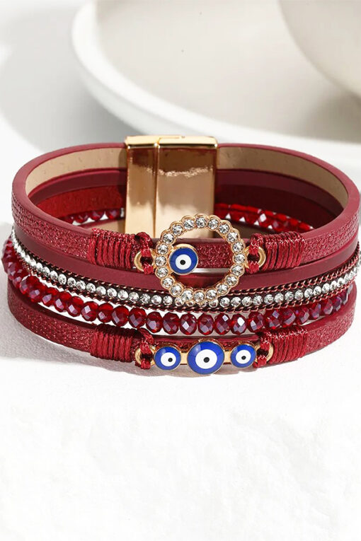 Ignite your spirit and elevate your style with this breathtaking Passion Red Multi-Strand Evil Eye Cuff. The cuff creates an instant “stacked” look with its carefully curated layers. It features smooth crimson bands, textured glittering strands, a row of dazzling clear rhinestones, and a strand of faceted red crystal beads that catch the light with every movement. At the center, a luxurious gold-tone circle charm haloed in crystals frames a vigilant blue Evil Eye, serving as the primary guardian against negative energy. Complemented by a secondary bar charm featuring three petite Evil Eyes, this piece offers quadruple the protection. Finished with a wide, secure gold-tone magnetic clasp, this bracelet is incredibly easy to wear, snapping on in seconds.
