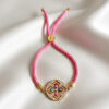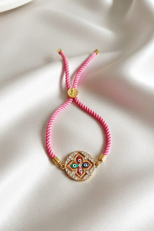 Add a playful splash of color and a layer of spiritual defense to your outfit with this intricate Pink Rope Co-Ord Evil Eye Bracelet. This accessory is designed for those who love detailed craftsmanship, featuring a vibrant pink twisted rope band that brings a cheerful energy to your wrist. Resting on this sparkling bed is a unique quatrefoil (flower-like) cross motif, where each petal houses a tiny enamel evil eye in a different color—red, green, and blue. This multi-colored arrangement is often believed to offer comprehensive protection, guarding against various forms of negative energy while celebrating diversity and harmony. Combining style with practicality, the bracelet is finished with a smart adjustable sliding clasp. The gold-toned slider, embossed with a detailed tree of life design, allows for a smooth, custom fit on any wrist size. Capped with polished gold ends, this piece is a delightful blend of modern fashion and ancient symbolism, making it a perfect gift or a personal lucky charm.
