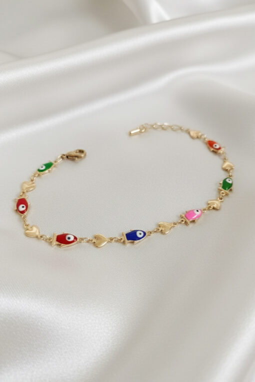 Adorn your wrist with this whimsical and durable gold charm bracelet. The fine chain is beautifully detailed with miniature gold heart links interspersed with a vibrant collection of enamel fish charms. Each fish is painted in a different color (including red, blue, green, and pink) and features a distinct Evil Eye motif, serving as a powerful and unique symbol of protection and good fortune. The combination of playful, aquatic charm and classic symbolism makes this bracelet a standout accessory. Its delicate appearance is perfect for layering or wearing solo, adding a touch of joyful elegance and meaningful protection to any outfit.
