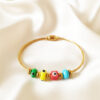 The centerpiece is a lively row of colorful enamel beads—in shades of lush green, sunny yellow, bold red, and sky blue—separated by polished gold spacers.