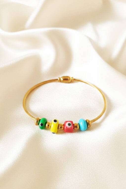 Playful Gold Cable Wire Bangle with Multi-Color Evil Eye Beads