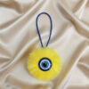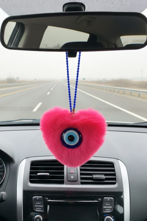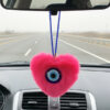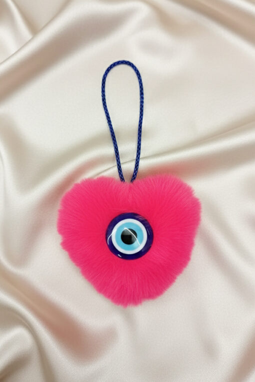 The charm features a soft, fluffy hot pink fur heart that immediately catches the eye, adding a fun, playful texture. Set brightly at the center of the heart is a classic blue and white glass Evil Eye bead, the globally recognized talisman used to ward off negative energy and bring good fortune. The plush heart symbolizes love, making this piece both affectionate and protective. It hangs from a durable blue cord, perfect for decorating backpacks, handbags, or hanging from a car mirror. This unique and delightful item makes an ideal and thoughtful gift, seamlessly blending trendy, plush style with powerful, meaningful protection.