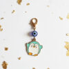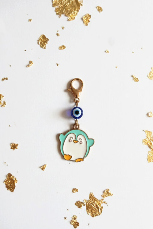The charm features an adorable enamel penguin, rendered in soft white and aqua blue, creating a cheerful focal point. Suspended just above the penguin is a classic blue and white Evil Eye bead, a powerful and traditional talisman believed to bring good luck and safeguard against negative energy. The charm is finished with a warm rose gold-toned lobster clasp, allowing for easy, secure attachment to zipper pulls, handbags, backpacks, keychains, or jewelry. This functional and decorative piece is an ideal, unique gift for animal lovers or anyone who appreciates a blend of whimsical design and meaningful, protective symbolism.
