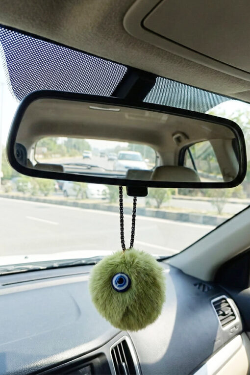 Bring a fresh pop of color and good fortune everywhere you go with this vibrant fur pom pom charm. The charm features a soft, fluffy sage green faux fur pom pom, adding a cheerful, unique texture to your accessories. Set brightly at the center of the pom pom is a classic blue and white glass Evil Eye bead, the globally recognized talisman used to ward off negative energy and bring good fortune. It hangs from a durable black beaded cord loop, perfect for decorating backpacks, handbags, or hanging from a car mirror. This unique and delightful item makes an ideal and thoughtful gift, seamlessly blending trendy, plush style with powerful, meaningful protection for everyday cheer and security.