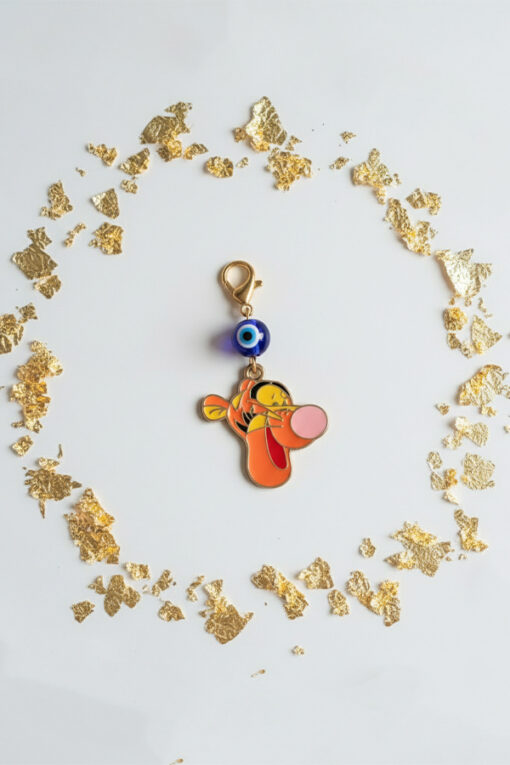 Add a burst of energy and protective charm to your belongings with this delightful clip-on accessory. The charm features the energetic and bouncy Disney character, Tigger, rendered in bright orange and black enamel. Suspended just above the character charm is a traditional blue and white Evil Eye bead, a powerful and ancient talisman believed to bring good luck and safeguard against negative energy. The charm is finished with a durable, gold-toned lobster clasp, allowing for easy, secure attachment to zipper pulls, handbags, backpacks, keychains, or jewelry. This functional and decorative piece is an ideal, unique gift that blends playful pop culture with meaningful, protective symbolism.