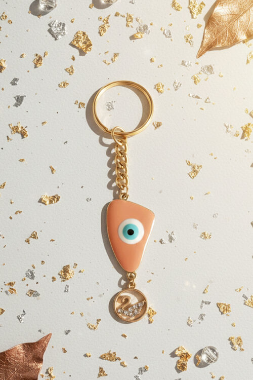 Chic Gold Evil Eye Keychain with Swan Charm in Soft Peach Enamel