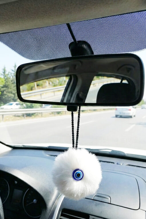 Add a touch of pure elegance and serene protection to your daily life with this exquisite White Fur Evil Eye Hanging. The star of this piece is a luxuriously soft, spherical white faux fur pom-pom, resembling a plush cloud. Nestled firmly in the center is a vibrant glass Evil Eye medallion. The deep blue of the talisman creates a stunning, high-contrast focal point against the snowy white background. This ancient symbol is celebrated worldwide for its ability to deflect negative energy, jealousy, and bad vibes, while inviting peace and good fortune. Unlike standard cords, this charm features a unique black faceted bead chain loop. This detail adds a sophisticated, modern edge and a subtle shimmer that catches the light. Versatile and stylish, it is the perfect size to hang from your car’s rearview mirror for safe travels, clip onto a handbag for a chic look, or display in your home. This accessory is a thoughtful gift for anyone who loves a blend of cozy textures and meaningful spiritual protection.