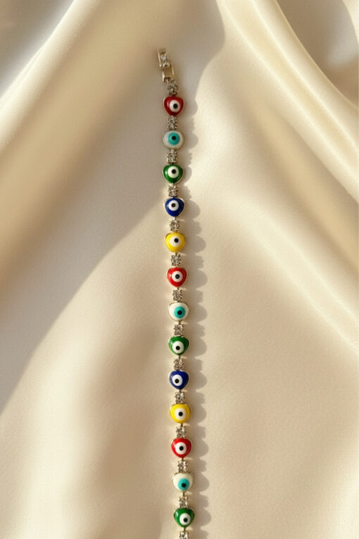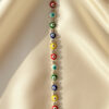 Adorn your wrist with this fun and protective Anti-Tarnish bracelet. The delicate Golden chain is beautifully lined with a continuous row of colorful Evil Eye charms. Each charm features smooth enamel in a variety of bright hues—including blue, yellow, red, and green—creating a dazzling, rainbow-inspired effect. Small, subtle crystal accents are interspersed between the charms, adding a touch of elegant sparkle. As a powerful, traditional symbol, the Evil Eye brings good fortune and safeguards against negative energy. This highly versatile bracelet is perfect for adding a playful yet meaningful pop of color to any outfit, making it an ideal gift or personal statement piece.