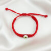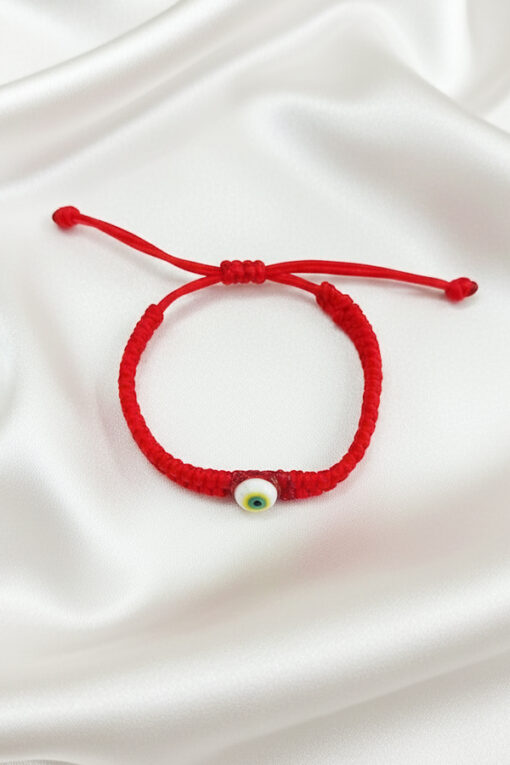 This handcrafted piece is woven from vibrant red thread, a color historically believed to deflect bad luck and shield the wearer from the “evil eye”. The design features a central ceramic-style bead showcasing a traditional eye motif with a unique yellow iris and black pupil against a white background. The bead is securely held in place by intricate macramé knotting, which adds a touch of artisanal texture to the slender band. Perfect for daily wear, the bracelet is finished with a practical sliding knot closure, allowing you to easily adjust the size for a snug and comfortable fit on any wrist. Simple, meaningful, and stylish, it is an ideal accessory for those seeking a pop of color and a layer of spiritual defense.