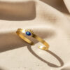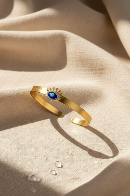 Adorn your wrist with this sophisticated and regal gold cuff bangle. The centerpiece is a stunning, elevated Evil Eye charm designed to look like a tiny crown or sunburst. The eye itself boasts a vibrant blue enamel iris, surrounded by a subtle halo of shimmering micro-pave crystals that add a touch of dazzling luxury. As a symbol of protection and good fortune, this bracelet is both deeply meaningful and incredibly fashionable. Its open-cuff structure allows for easy, comfortable wear and a perfect fit. This piece is ideal for those who appreciate distinctive, high-quality jewelry that makes an elegant and powerful statement.